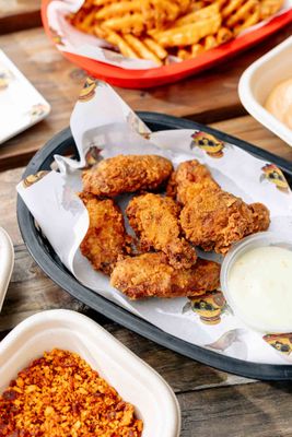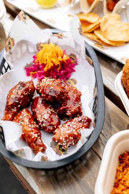 Swicy Sauce, Plant Based Chicken / Real Chicken / Cauliflower, Kimchi Radish Slaw, Sriracha Mayo, Coriander