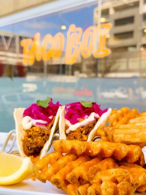 2 Tacos (same flavour) + side of waffle fries On Tuesdays Only! *Note* Pick ups cost $1 extra for the Takeaway Taco Box
