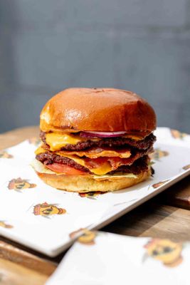 Double smashed Pattie, American Cheese, Chipotle Sauce, Onion, Lettuce,Tomato, Bacon