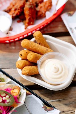 House BBQ, Pulled Pork Shoulder, Mozzarella Sticks, Pickled Coleslaw